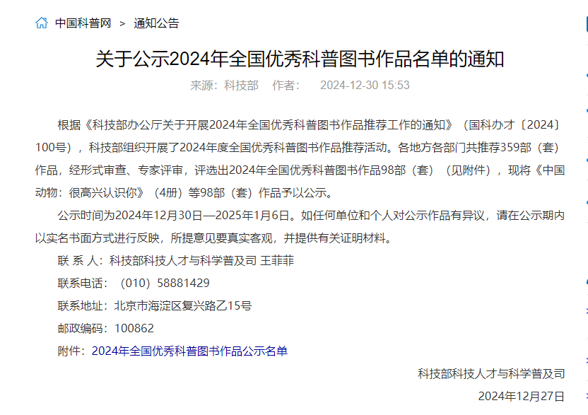 2024年12月底,科技部科技人才與科學普及司公示了2024年全國優秀科普圖書作品名單。