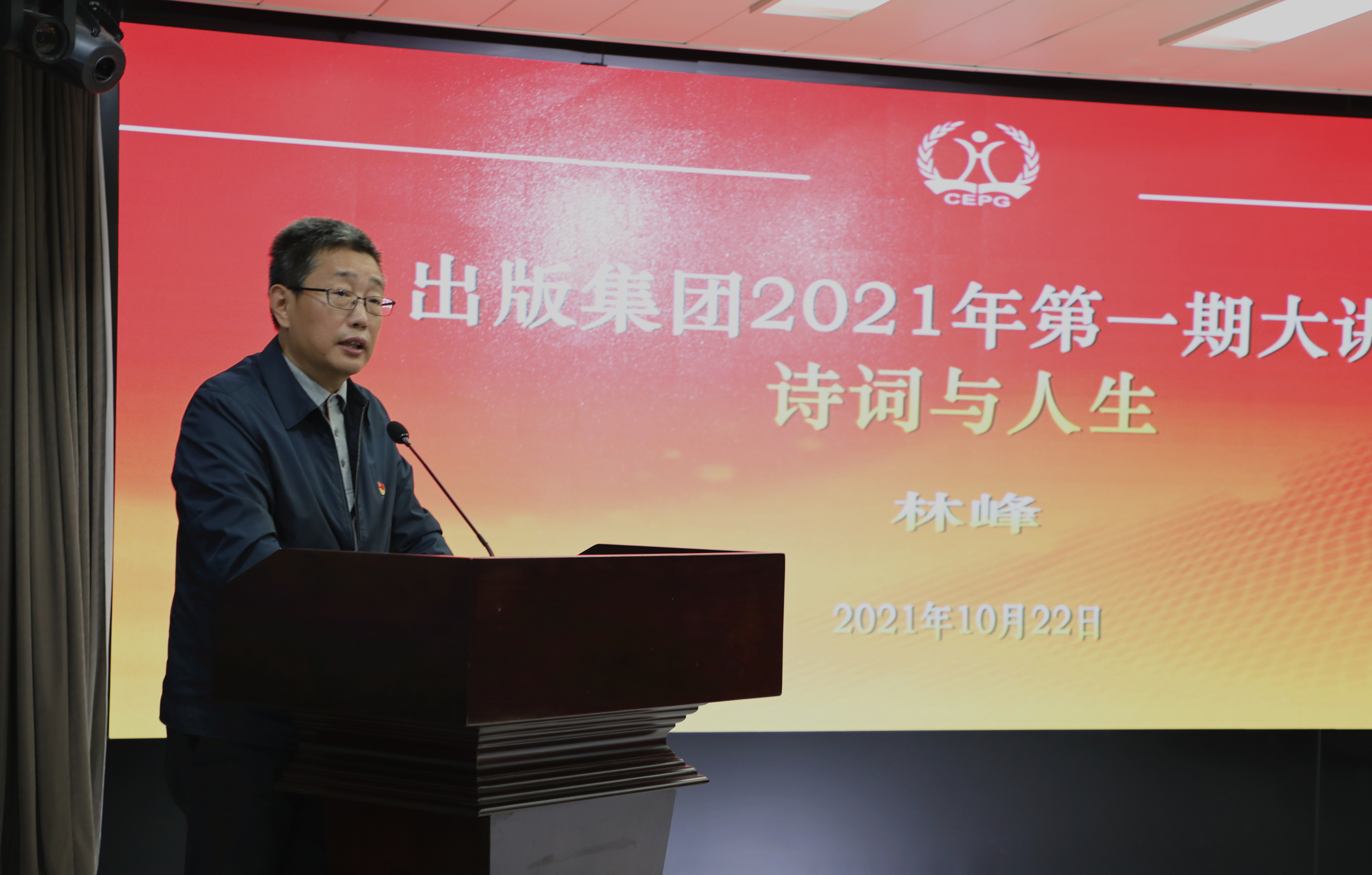 2021年10月22日,出版集團舉辦2021年大講堂活動,中華詩詞學會副會長兼理論研究與評論部主任、中華詩詞雜志社副主編,首都師范大學特聘教授,上海大學中華詩詞創作研究院副院長林峰先生就“詩詞與人生”做專題講座。集團公司黨委書記、董事長武德凱主持了講座,集團公司全體干部職工通過現場、分會場、視頻會議聆聽了講座。