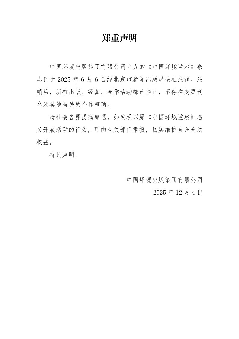 中國環境出版集團有限公司主辦的《中國環境監察》雜志已于2025年6月6日經北京市新聞出版局核準注銷。